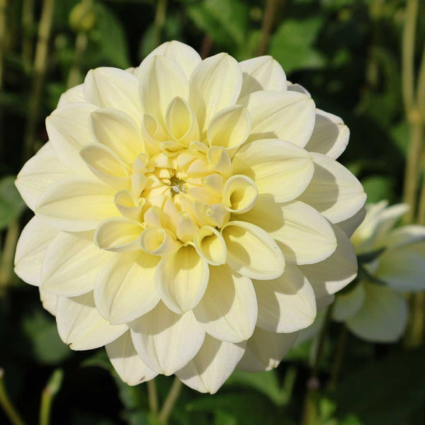 Jättimäinen, jättimäinen. Jotkut yksilöt kukkivat jopa 26-senttisinä! Puhtaan valkoisena kukkiva dahlia kauniissa suorissa varsissa, katse eteenpäin suunnattuna.