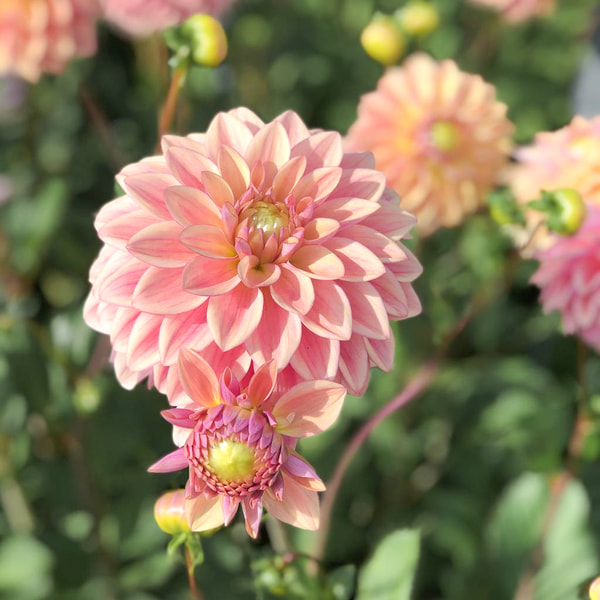 Farmin myydyin tuote, jota kaikki morsiamet rakastavat ja joka sopii kauniisti asetelmiin. Jättimäiset kukat, joiden väri on pehmeä puuterin sävy, paikoitellen vaaleanpunaiseen vivahtava. Daaliapellolta ei löydy hienostuneempaa väriä.