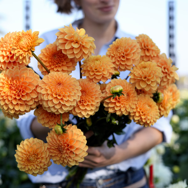 Erittäin luotettava leikkodaalia, ja tilallamme yksi suosituimmista lajikkeista yksilajisiin kimppuihin. Vaaleat oranssin sävyt ovat erittäin kylläisiä ja säännöllisiä, lukuun ottamatta keskustaa, joka kuultaa hieman keltaisena. Kukat ovat melko suuria, ja terälehdet kiertyvät päästään hienoksi kärjeksi.