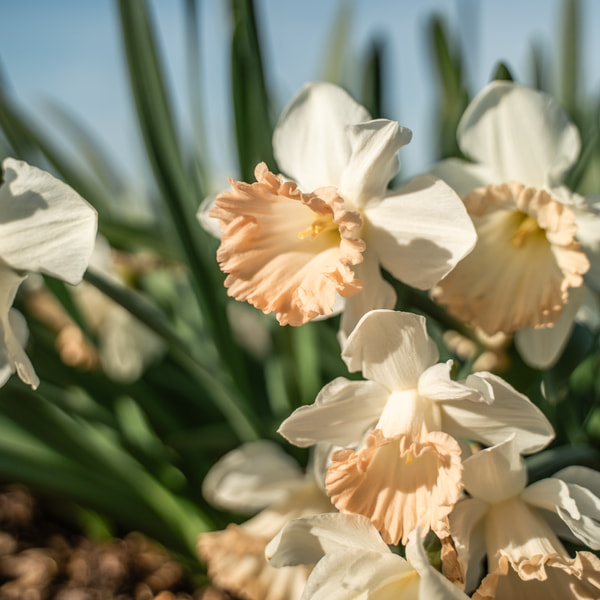 Useimmilla narsisseilla on oranssi tai keltainen keskusta, mutta viime aikoina trendinä ovat olleet pehmeät pastellivärit. Olemme metsästäneet ja etsineet jo vuosia, tutkineet jokaisen vastaantulevan puuterisen, lohenpunaisen ja aprikoosinvärisen narsissin. Ja tänä vuonna tärppäsi vihdoin! Palmares on yksinkertainen narsissi, mutta keskustan terälehdet ovat aaltoilevat, joten se vaikuttaa kerrotulta. Väriksi ilmoitamme puuterisen persikan!